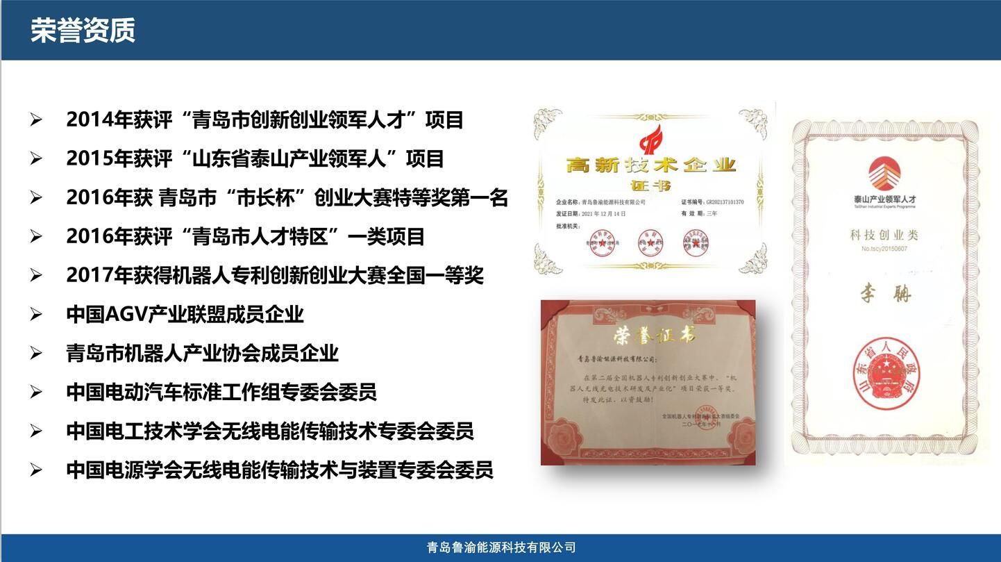 青島魯渝能源科技有限公司成立于2014年,是一家大功率、工業(yè)級(jí)無(wú)線電能傳輸產(chǎn)品研發(fā)、生產(chǎn)、銷售、服務(wù)于一體的國(guó)家級(jí)高新技術(shù)企業(yè)。行業(yè)首創(chuàng)無(wú)線快充技術(shù),充電電流達(dá)200A以上,是機(jī)器人無(wú)線充電行業(yè)領(lǐng)先企業(yè)。