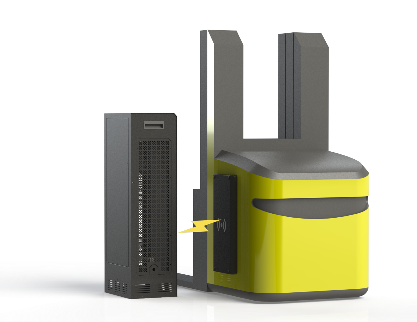 傳統的電動叉車普遍的充電方式是將蓄電池電纜與電動叉車電纜的插頭連接進行充電。目前也有一些無人叉車使用自動充電的方式,但是依靠裸露的電極,進行接觸式充電。但是,這些充電方式在實際應用中存在很多行業痛點:在人工插拔的時候操作非常困難;現場工人在使用過程很容易造成充電插頭的損壞而導致充電故障,影響叉車的使用;如果充電器的插不到位會因電阻過大導致接頭損壞;必須經常擦拭并保持干燥清潔,否則會腐蝕電極和連接條,繼而損害電池;在充電過程中忌中途停止,必須要充到充電機顯示充滿為止,限制了叉車的搬運時間;需要配置多塊備用電池,以保證叉車的正常搬運工作不受影響,增加了資金投入;需要人為的插拔充電和定期的檢查維護。另外,在一些具有危險氣體、潔凈的使用環境中,也嚴禁充電過程中出現拉弧、打火等現象。